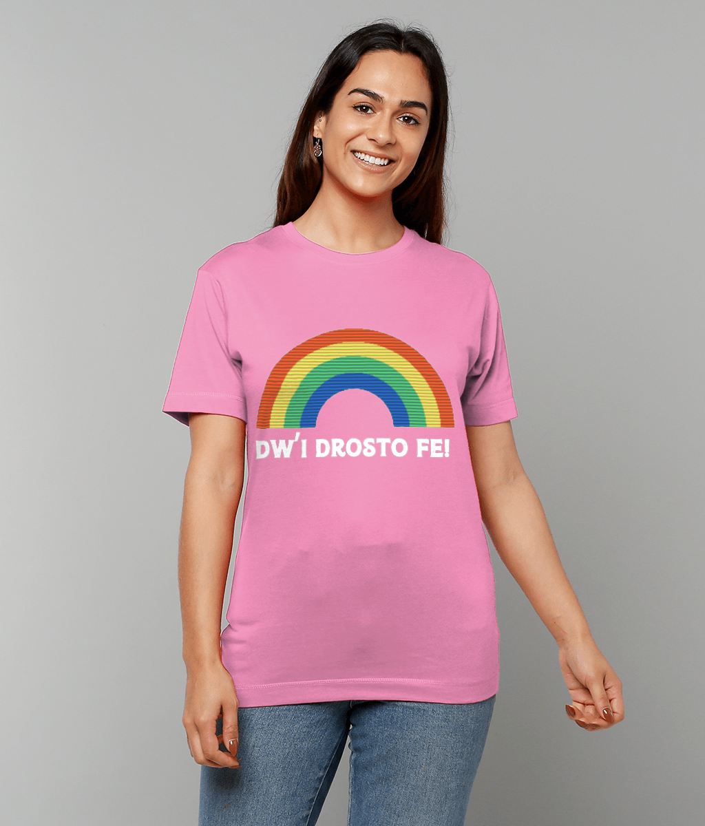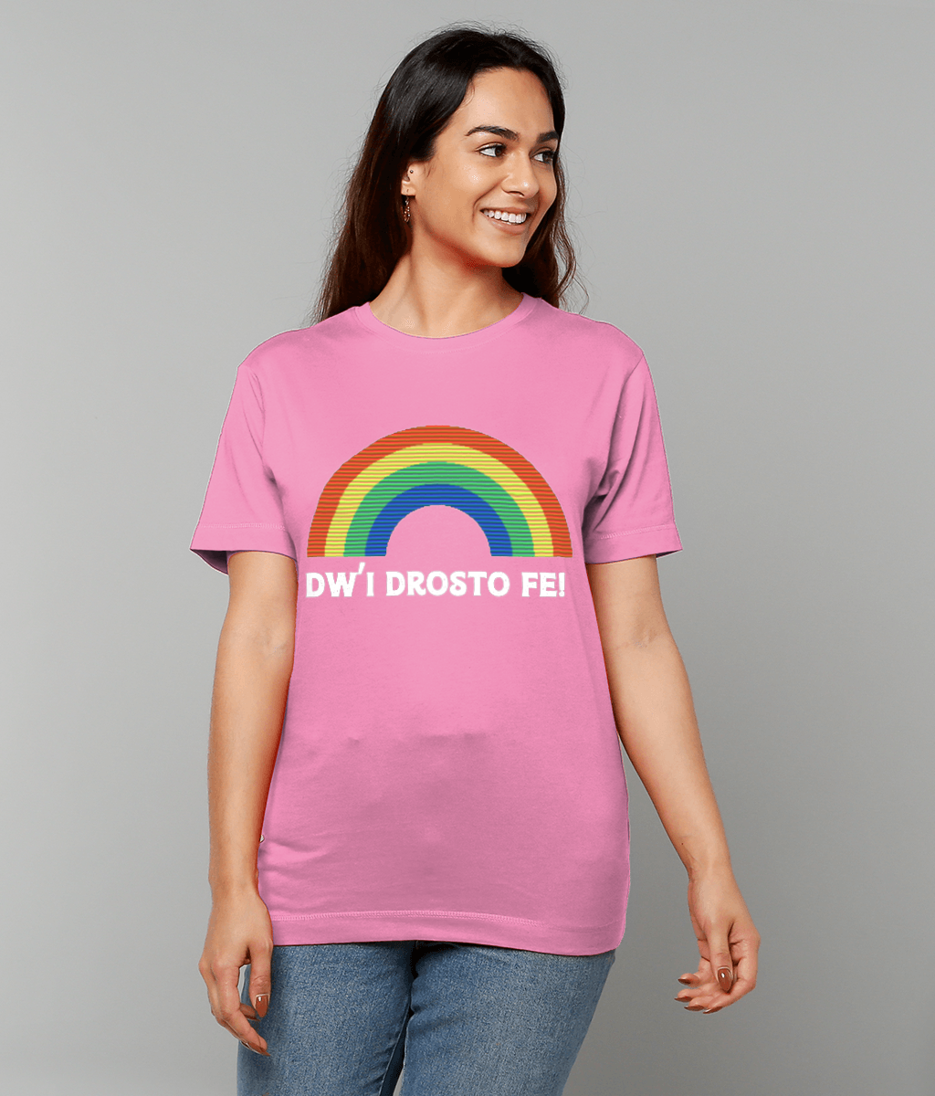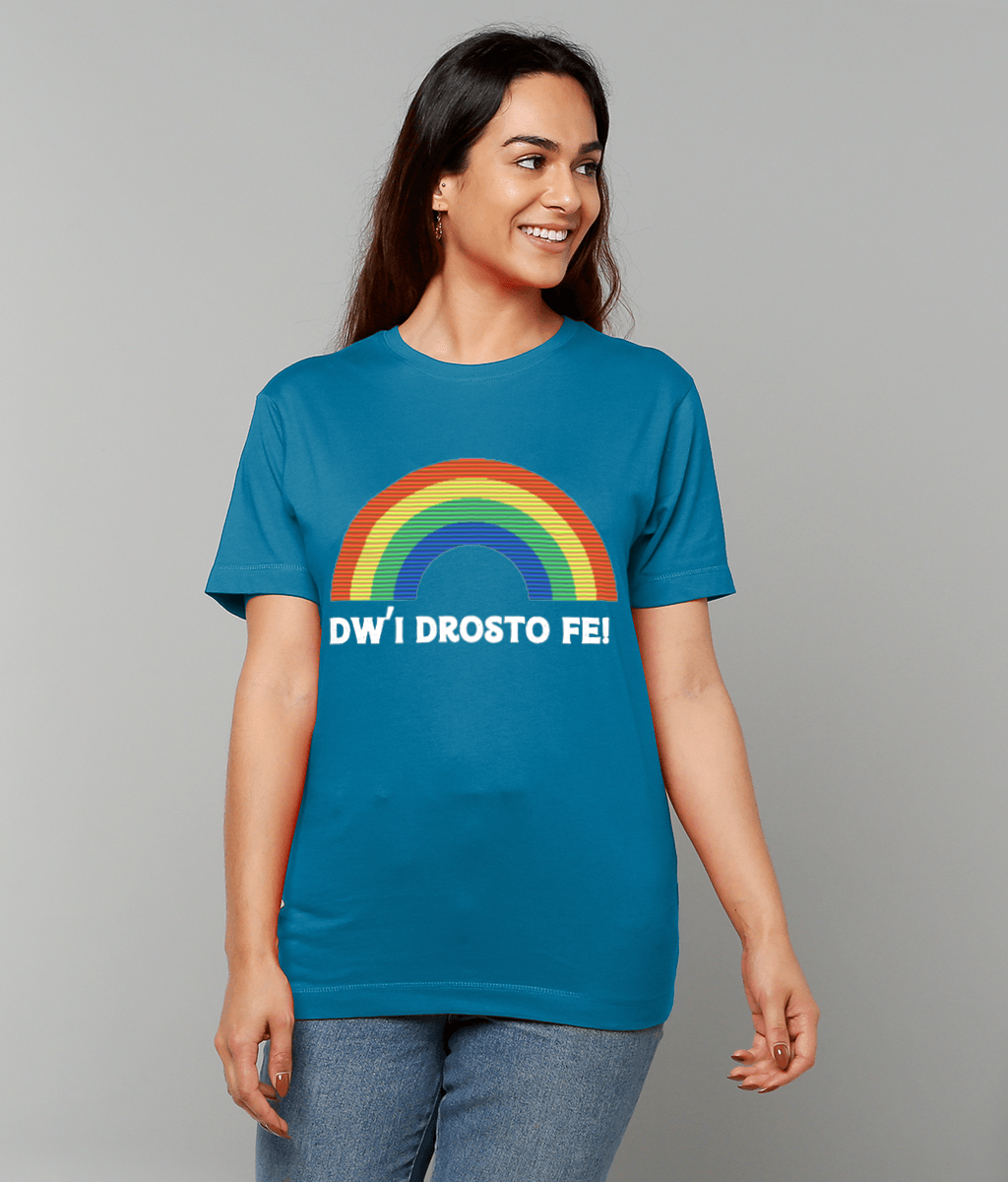 Add a playful touch to your wardrobe with the Dw'i Drosto Fe! Women's T-Shirt. Translating to 'I'm over it' in English, this cheeky Welsh phrase is paired with a colorful rainbow, making a bold statement. Crafted from luxurious 100% cotton jersey fabric, it’s smooth, gentle on the skin, and ultra-comfortable for everyday wear.